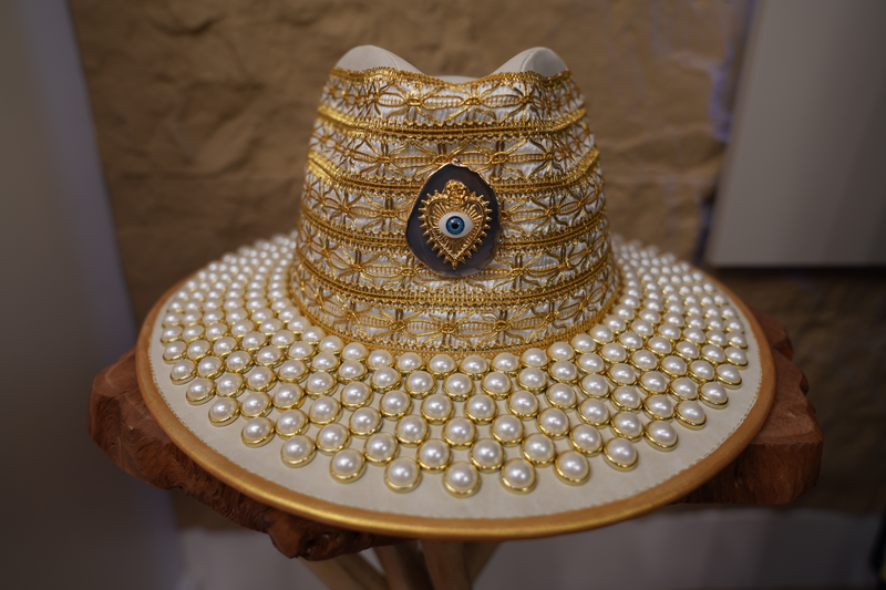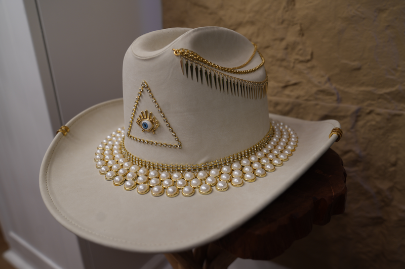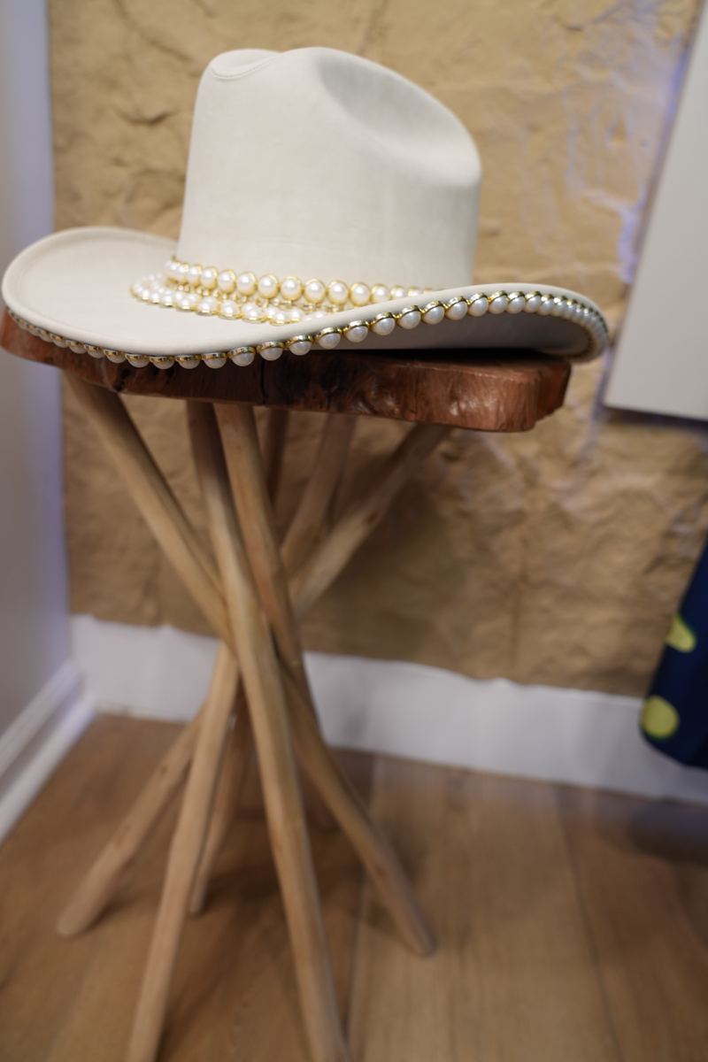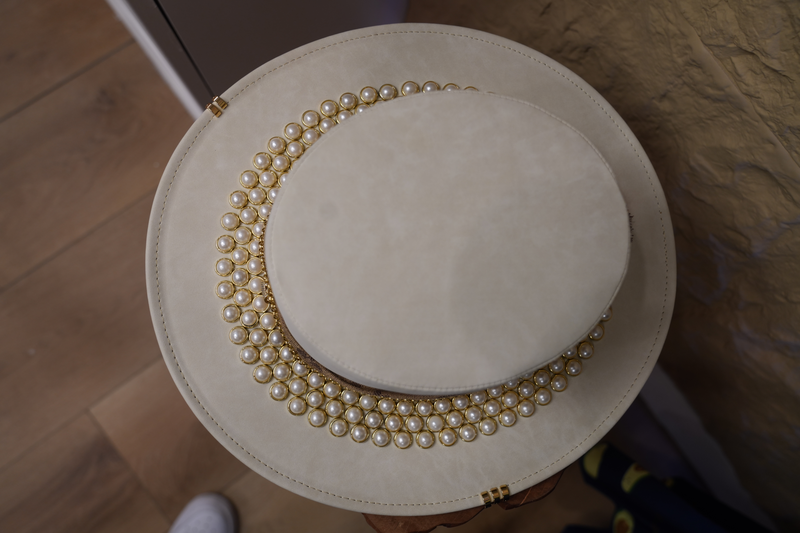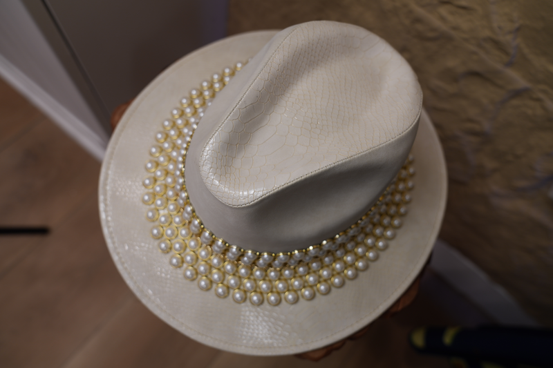 White hat with jewelry and pearls