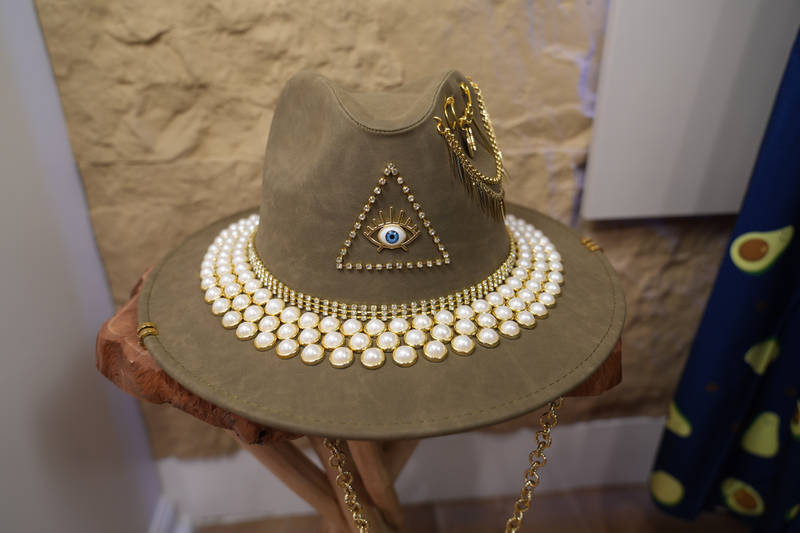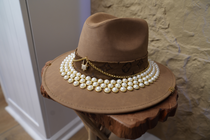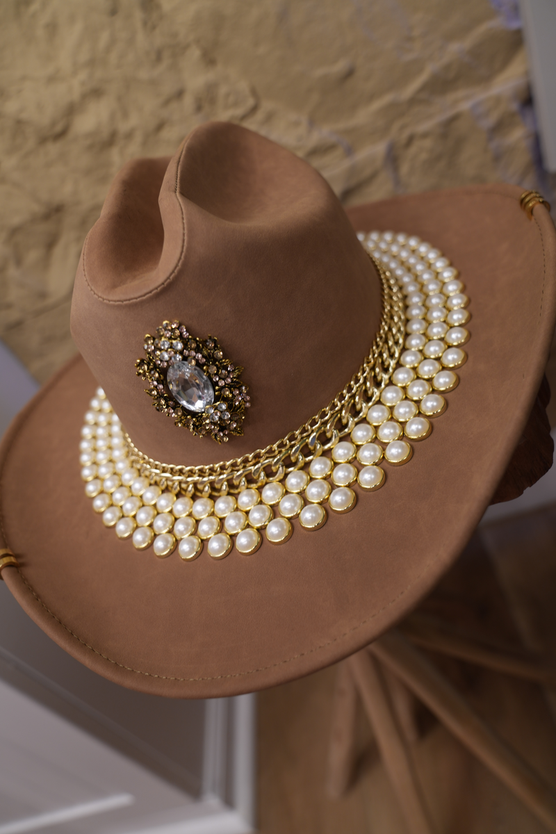 Brown hat with jewelry and pearls