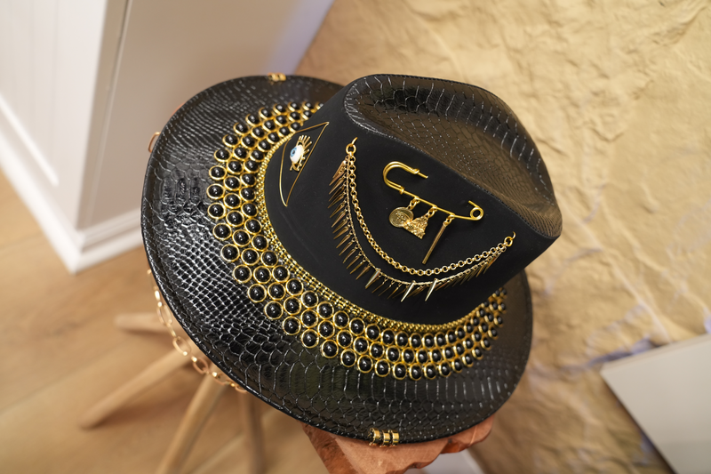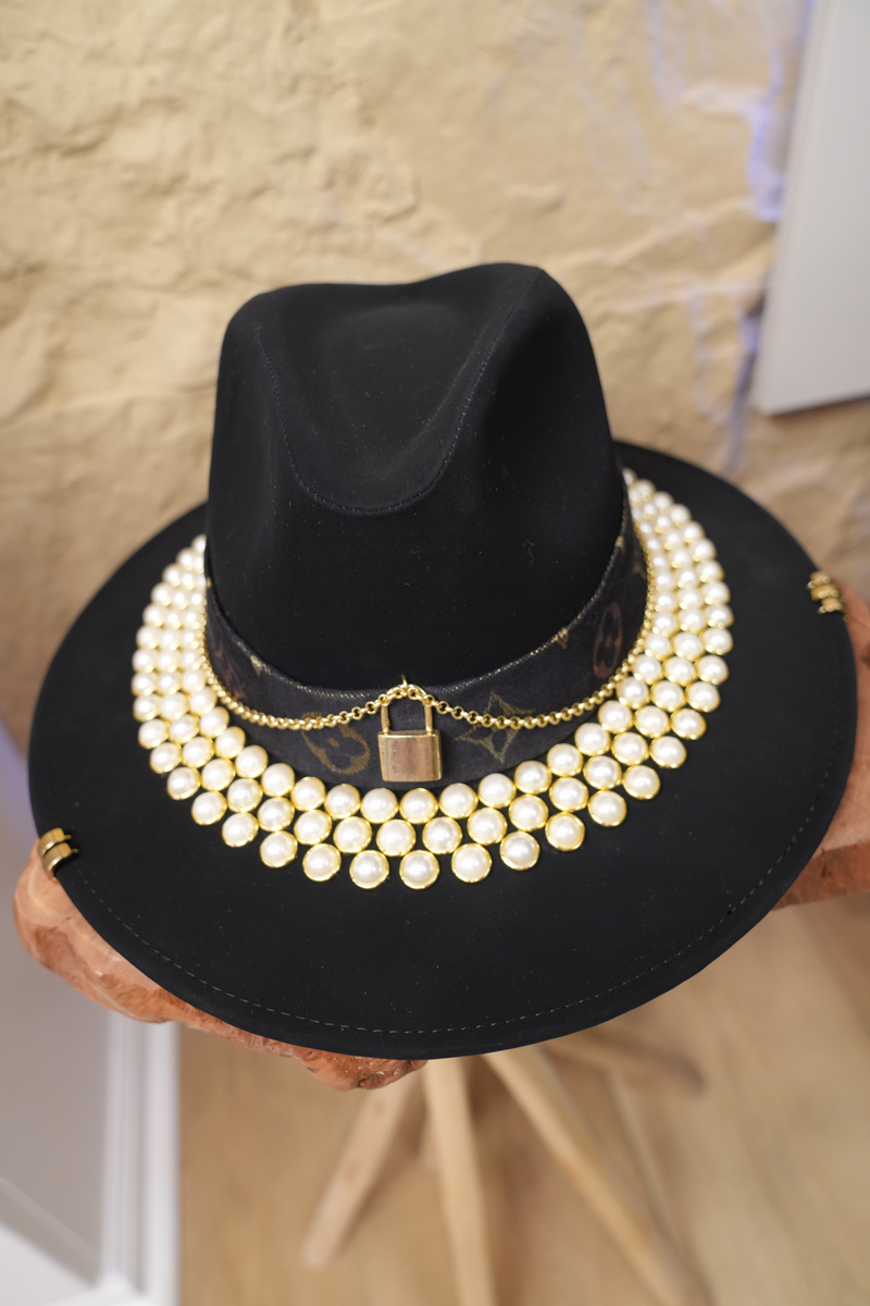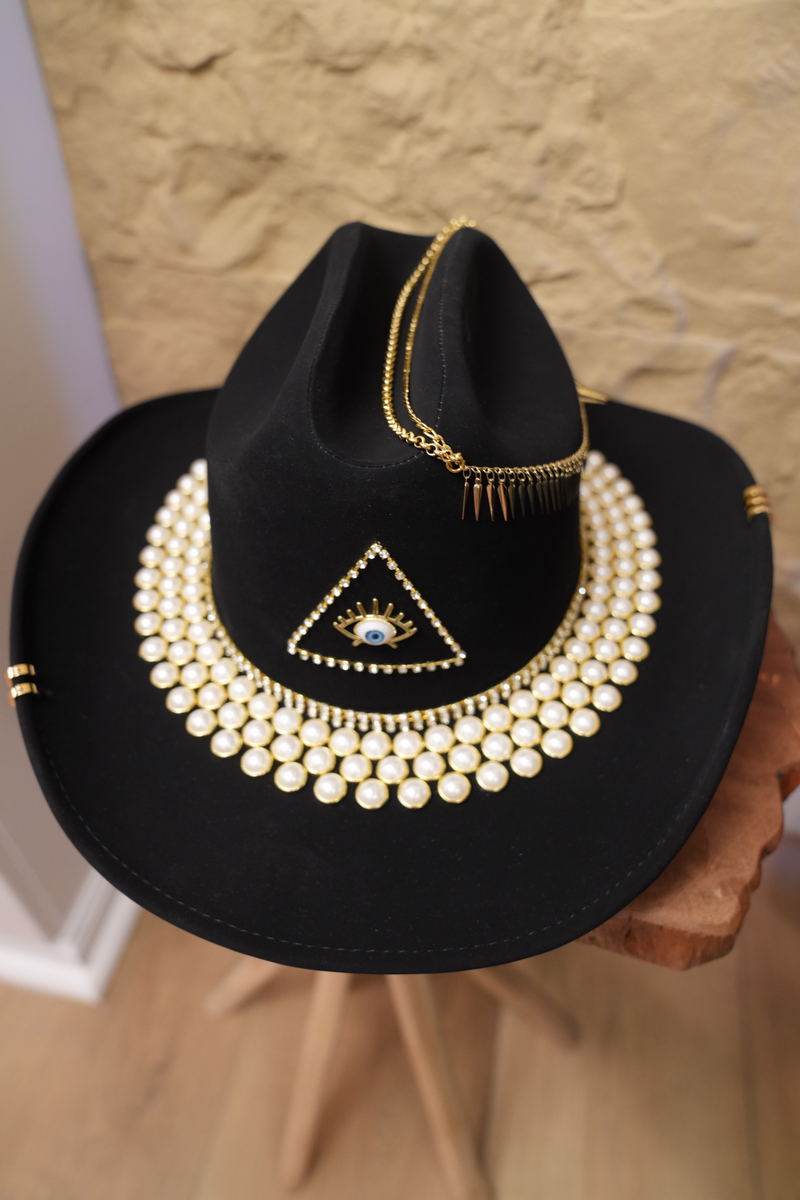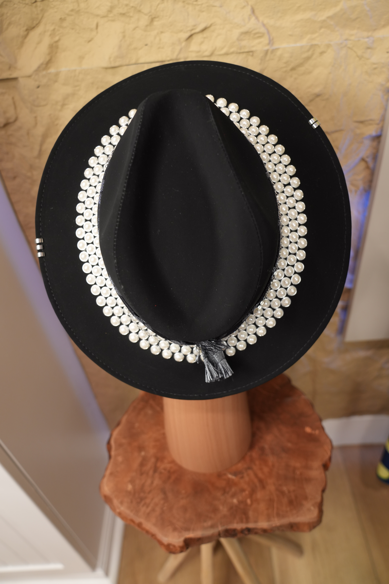 Black hat with jewelry and pearls